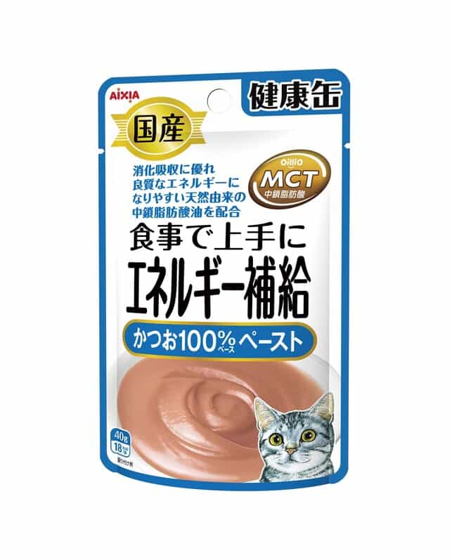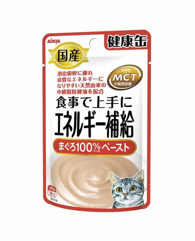 Aixia Kenko POUCH - ENERGY Tuna Paste is a unique pouch food that combines MCT (medium chain fatty acid oil) to support health maintenance. MCT are good in digestion and absorption, so that your cats can produce energy easily. Suitable for cats on dry food diet or cats not drinking enough water.