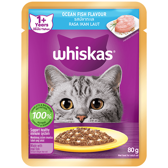 Whiskas Pouch Wet Cat Food is a 100% complete and balanced meal formulated for adult cats (1+ years) and kittens, featuring real meat or fish in gravy/jelly. It supports hydration, healthy digestion, and a shiny coat with essential nutrients like Omega 6, Zinc, and Taurine.