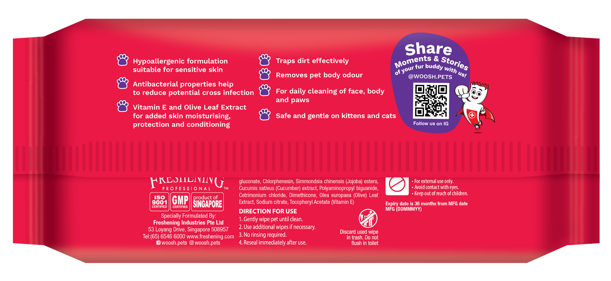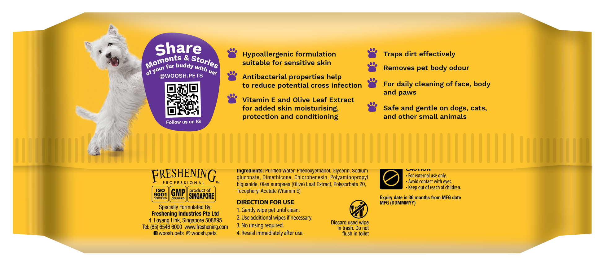 Woosh Antibacterial Scented Pet Wipes with vitamin E & Olive leaf extract cleans and protects your fur-buddies, suitable for their face, body and paws. Safe and gentle on dogs. cats and other small animals for daily cleaning and removal of pet odour - making your fur-buddies smell good, feel fresh.