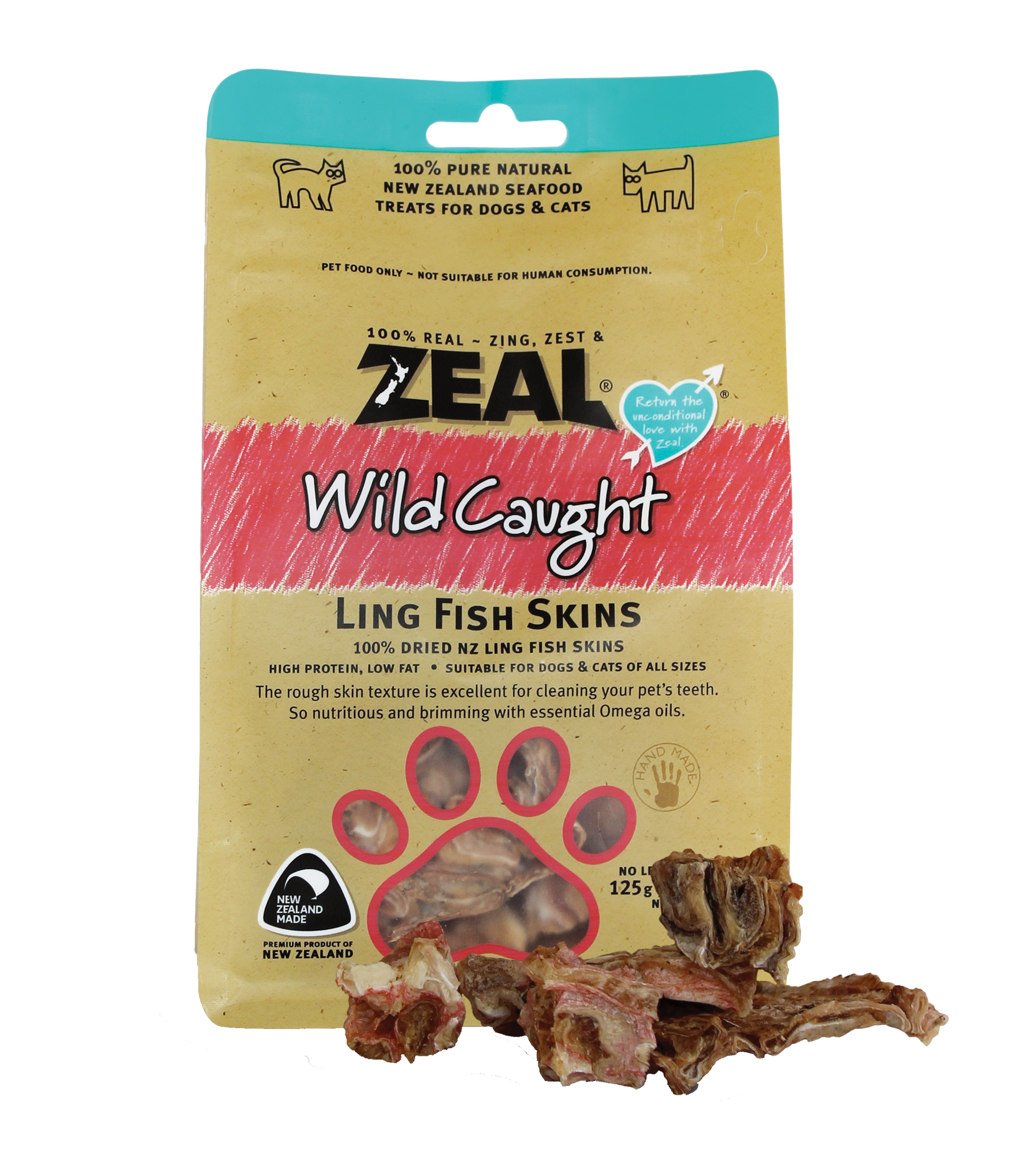 Zeal free range naturals ling fish skins cat & dog treats are 100% pure natural Zealand seafood treats. High in protein and low in fat, they are suitable for cats & dogs of all sizes. Their rough skin texture makes it excellent for cleaning your pet's.
