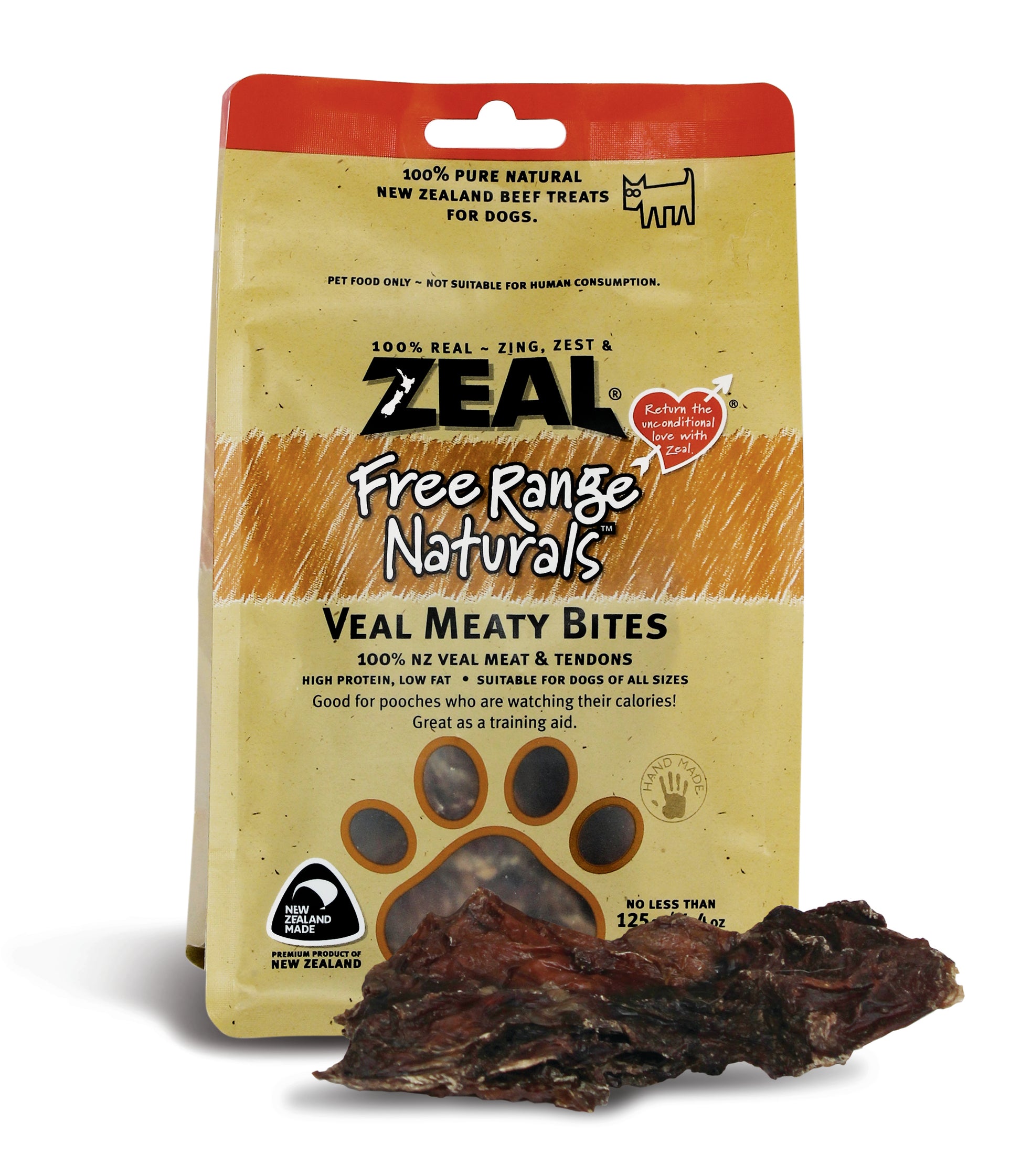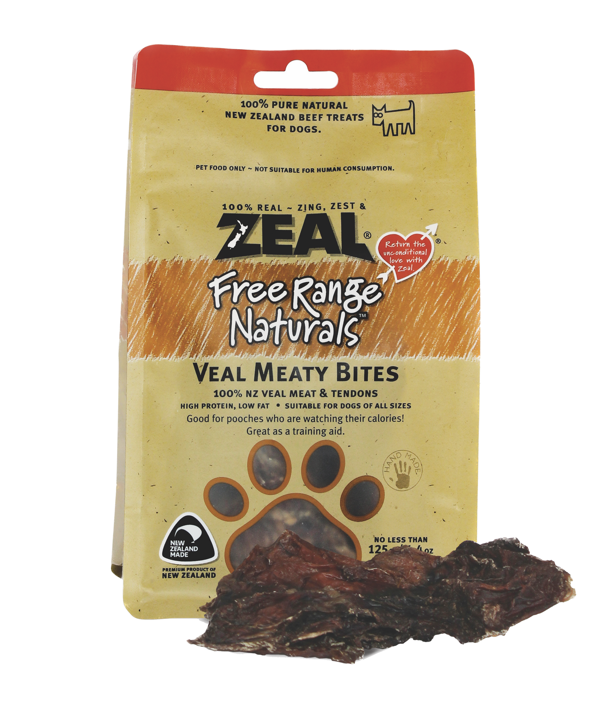 Zeal Free Range Naturals Veal Meaty Bites Dog Treats are made from air-dried free range New Zealand beef with no colourings, flavourings, additives or preservatives. High in protein and low in fat, they are a tasty and healthy source of nutrients.